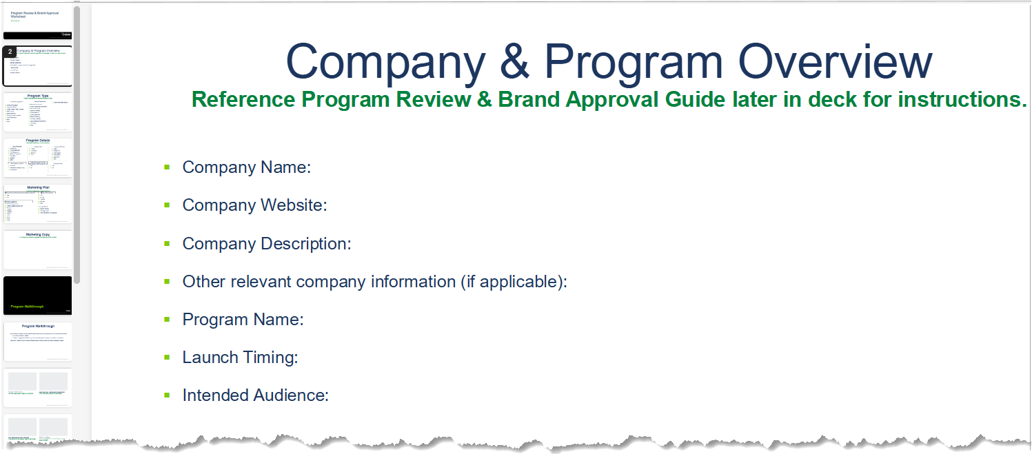 The Program review and brand approval worksheet collects comprehensive information needed to evaluate your reward program for compliance and approval, including an overview of your company and audience, the purpose and structure of your program, participant locations and expected scale, how and why rewards are issued, and projected issuance volume. It also gathers details on marketing plans and brand promotion, required brand display elements such as approved names, images, and disclaimers, and documentation of the full participant experience—from sign‑up and earning rewards to redemption and delivery—supported by screenshots that clearly show how specific brands are presented.